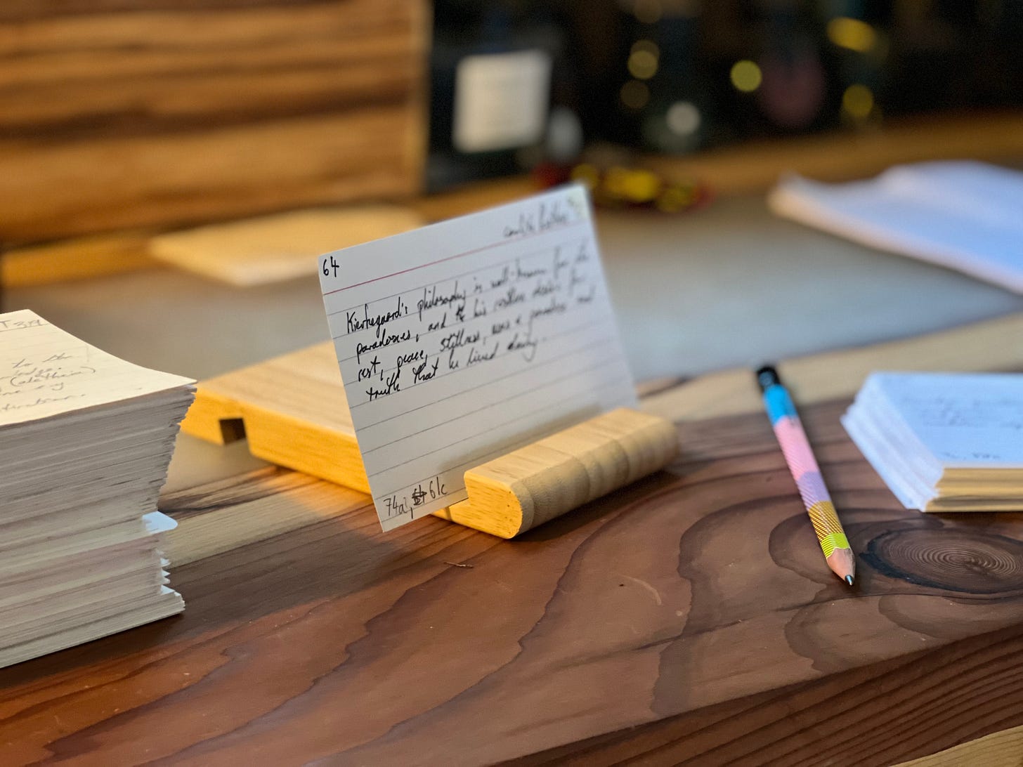 I took a sort of hiatus with my Zettelkasten for most of 2022. And a hiatus from writing. But now that I’m trying to write more regularly again, I find myself stuck with a blank page more often than not. But I’ve also been able to cultivate a habit of waking up, regularly, at 6am. This gives me a good hour of time before I have any other obligations. And as I lay in bed last night, I thought about my Zettelkasten. You see, one of the main problems with a physical Zettelkasten is that it takes a lot of time to keep up. The more cards you create, the longer it takes to place them and connect them with the ever-increasing number of cards you already have. This is the primary problem that A.I. solutions attempt to resolve. But this isn’t a problem at all. In fact, it’s the main feature. Polt, ever insightful, has this to say: “When what you’re doing isn’t just a means to an end, you’re in no hurry to get it done.”8 Zettelkasten isn't about efficiency. It's about thinking, and thinking deeply. Thinking creatively. Thinking in ways that haven't been thought before, about things and connections that haven't been made before. There's no hurry, here. Just as you don't hurry through a conversation with an old friend.